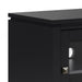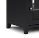- Features two (2) sliding tempered glass doors that open to a cabinet with two (2) adjustable shelves