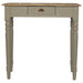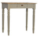 - Hand Painted Writing Desk - This one drawer writing desk is constructed from 100% solid mango wood and has a french grey hand-painted base and a stained oak-ish top. Other features include hand-carved flute legs to add to the vintage French style and a shell handles for easy access into the drawer. The perfect addition to any home.