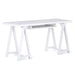 - Features a simple and wide, extra thick table top surface, integrated wood keyboard tray and sturdy sawhorse supports