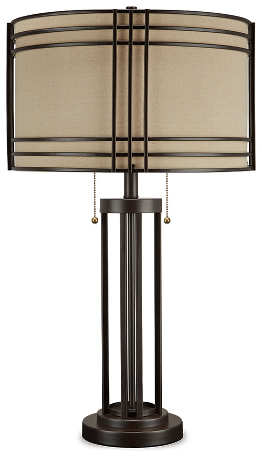 Add a touch of rustic industrial style to your decor with this eye-catching table lamp. Its drum shade and decorative metal frame bring an appealin...