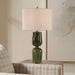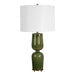 This Shapely Ceramic Base Is Finished In A Moss Green Glaze Accented With Lightly Antiqued Brass Plated Details. The Round Hardback Drum Shade Is Covered In A White Linen Fabric. Due To The Nature Of Fired Glazes On Ceramic Lamps, Finishes Will Vary Slightly.