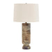The Vale Table Lamp Boasts A Unique Ceramic Base With Horizontal Grooves, Finished In A Subtle Gray Wash With Warm Beige And Earthy Brown Hues, All Accented With Antique Brass Plated Details. The Slightly Tapered Round Shade Is Covered In A Warm White Linen Fabric.