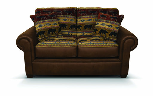 The lodge look is alive and well in our Jaden group. A three cushion style in married fabrics with pyramid legs and rolled and welted arms. Toss pi...