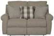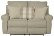 The WESTPORT power lay flat reclining loveseat features a Farmhouse Casual style with its Greek Key arm treatment, soft body fabric, and included accent pillows.