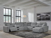 Details Includes 7 modular pieces: left-arm facing power recliner, power armless recliner, armless chair, wedge, 2 consoles with audio systems and right-arm facing power reclining back chaise, "Left-arm" and "right-arm" describe the position of the arm when you face the piece, Versatile modular pieces fit together in a variety of configurations, One-touch power control with adjustable positions, Easy View™ adjustable headrest and zero-draw USB port, Zero-draw technology only consumes power when the USB receptacle is in use, Corner-blocked frame with metal reinforced seat; attached seat and back cushions; high-quality foam cushions wrapped in poly fiber, Polyester upholstery; Next-Gen Nuvella™ is a family-friendly fabric that is soft, easy to clean, stain-resistant and durable, Clean fabric with mild soap and water, let air dry; for stubborn stains, use a solution of 4 oz. bleach to 28 oz. water, Throw pillows with easy-to-remove zippered covers for machine washing; pillows with soft polyfill, Console with plexiglass top; built-in audio sound system with wireless connectivity; audio controls located on console; USB charging, Zero wall recliner design requires minimal space between wall and chair back, Power cord included; UL Listed