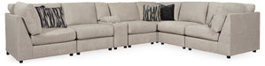 Details Includes 7 pieces: 3 armless chairs, console with storage and 3 wedges, Corner-blocked frame, Loose cushions, High-resiliency foam cushions wrapped in poly fiber, Throw pillows included, Polyester upholstery, Console with hidden storage, 2 cup holders and USB port, Exposed feet with faux wood finish, Platform foundation system resists sagging 3x better than spring system after 20,000 testing cycles by providing more even support, Smooth platform foundation maintains tight, wrinkle-free look without dips or sags that can occur over time with sinuous spring foundations