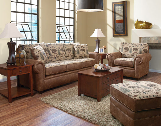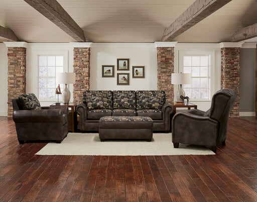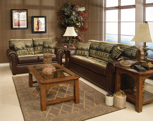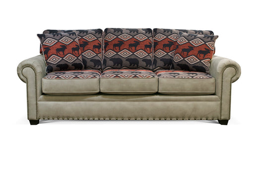 The lodge look is alive and well in our Jaden group. A three cushion style in married fabrics with pyramid legs and rolled and welted arms. Toss pi...