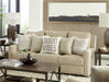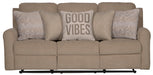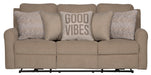 Calvin has a transitional design with a modified track arm and soft chenille fabric. A fashionable mix of accent pillows includes a "Good Vibes" emoji pillow. Calvin is available in your choice of two colors - Otter or Putty.
