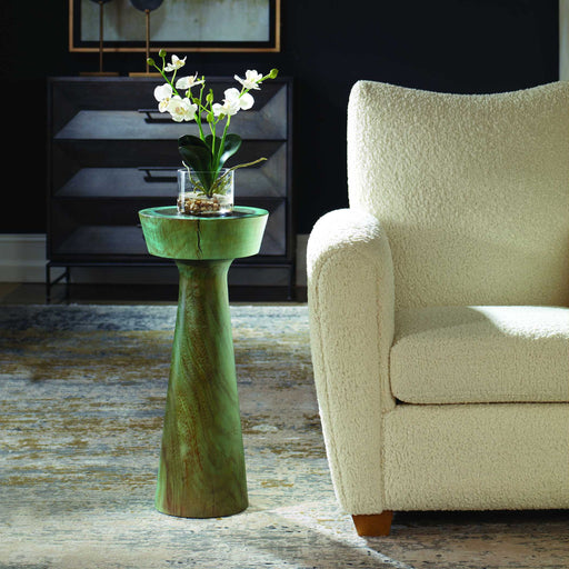 Crafted From Solid Suar Wood, This Drink Table Features A Striking Blend Of Blue And Green Tones That Enhance Its Natural Grain And Organic Form. T...