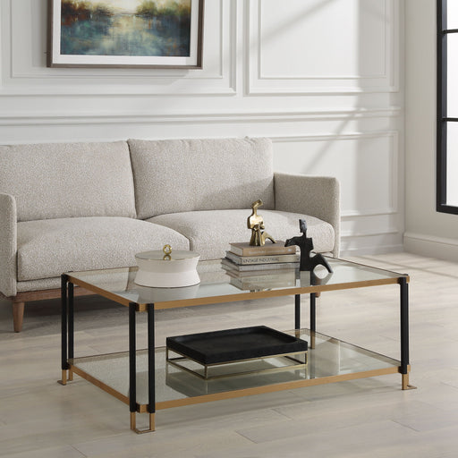 Featuring A Clean Lined Solid Iron Frame, This Contemporary Coffee Table Is Finished In A Two-toned Matte Black And Gold Leaf. Has Two Tempered Gla...