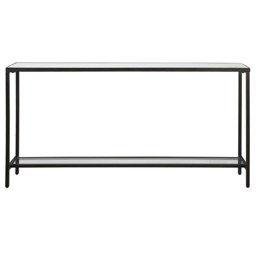 Classic And Minimalistic, This Narrow Console Table In Steel Is Finished With A Streamlined Rustic Black, Inset With A Beveled Mirrored Top, And Ga...