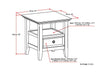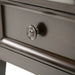 - Transitional design includes tapered legs, molded crown edged table top, panel framed drawer fronts and antique bronze round decorative knobs