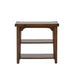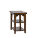 Accent your space with the traditional Aspen Skies chair side table. Crafted of pine solids and New Zealand pine veneers with metal accents, this piece features a brown finish, appealing planked top with metal accents and nail heads on each corner, two open design shelves for additional storage, anchored by a tapered leg design. A wonderful addition to any rustic style space.