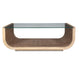 This Coffee Table Features A Curved Mahogany Silhouette In A Driftwood Grey Finish, With A Hollowed Center Adorned In Natural Toned Woven Wood Detailing, Topped With A Sleek Glass Surface.