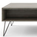 - Industrial design includes four (4) black iron hairpin legs
