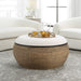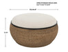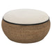 A Unique Blend Of Casual And Coastal Styles, This Ottoman Is A Versatile Storage Piece With A Removable Lid. Can Be Used As Seating, A Footrest, Or Cocktail Table. The Round Base Is Wrapped In Natural Braided Straw With Matte Black Iron Details And A Plush Upholstered Seat In Light Beige Performance Fabric.