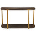 The Palisade Console Table Is Finished In A Rich Coffee Finished Oak Veneer With Natural Wood Grain Details Accented By Forged Metal Columns Finished In Mottled Antique Gold.