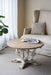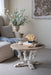 • Farmhouse Design: Decorative coffee table with a fresh take on classic designs, featuring a round, spacious top and intricately crafted ornamental legs.