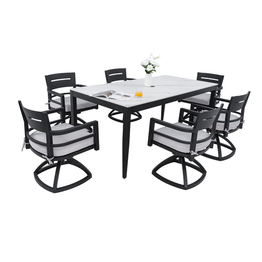 Dining Set:Includes a rectangular table with a marble-inspired sintered stone top and 6 swivel rockers. Tabletop: Crafted from high-quality sinter...