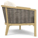 - The fiber filled back cushion and 3.5 inch thick high density foam seat cushion are covered in a water resistant, durable Natural fabric.