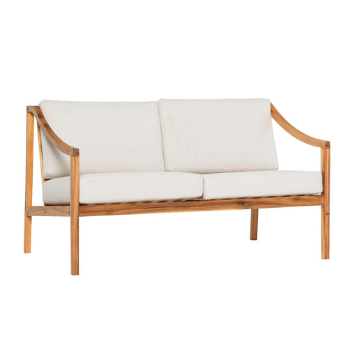 Contemporary, minimalist frame Removable upholstered cushions Made with responsibly sourced, stained solid acacia wood Slatted wood backrests and ...