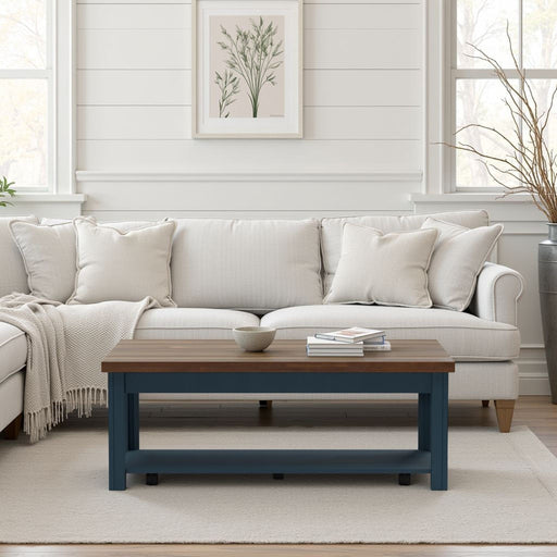 Dimensions: 48 inches wide x 24 inches deep x 18 inches high Made of Poplar Solids and Okoume Veneers with Knotty Alder Top Two-Tone Blue Denim an...