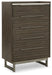 Clean lines lend sophistication and structure to this chest of drawers. Its complex rich grayish brown finish contrasts perfectly with a white marble top, while the streamlined silhouette features overlay slats to create visual interest. A metal base and bar pulls in a low-sheen steel finish add to this piece's contemporary vibe.