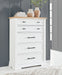 Casual style with substance. This two-tone chest of drawers raises the bar on comfortably cozy design in your soothing sanctuary. A sturdy silhouette with a classic white finish and black metal hardware exudes modern farmhouse vibes. The butcher block oak veneer top adds a relaxed aesthetic. And this charmingly curated piece is spacious enough for all your essentials.