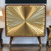 - Avora Brass Embossed 2 Door Chestnut Cabinet - A true statement of luxury and craftsmanship, this cabinet is handcrafted from 100% Solid Mango Wood in a rich chestnut finish, featuring an eye-catching brass embossed front. The intricate sunburst pattern creates a radiant visual effect, adding elegance and sophistication to any space. Resting on sleek, tapered Nordic-style legs with brass caps, this piece effortlessly blends mid-century charm with contemporary design. Offering ample storage behind its beautifully adorned doors, it is both functional and stylish, making it a perfect addition to dining rooms, living areas, or hallways.