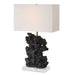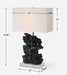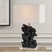 Crafted From A Black Man-made Stone, This Unique Table Lamp Replicates A Rock Sculpture That Boasts Heavy Texture With Distinctive Holes, Displayed Atop A Thick Crystal Base With Plated Antique Brass Hardware. The Rectangle Drum Shade Is Covered In A Crisp White Linen Fabric.
