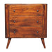 - Solid wood Bera Chest 3 Drawers - The Bera Chest is ideal for adding a contemporary style to any bedroom. It is perfect for maximizing space while staying on trend with 3 spacious drawers. It is constructed from 100% solid mango wood in a chestnut finish and nordic style legs, with shiny brass knobs on the drawers.