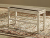 The beauty of this upholstered dining bench is something to savor. Serving up comfort and flair, this generously scaled counter-height bench entices with a cushioned seat covered in a heavy woven fabric that complements the antiqued white finish.