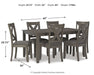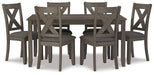 Details Includes dining table and 6 chairs, Table made of wood, acacia veneer and engineered wood; chairs made of wood, Antiqued gray wash finish, Foam cushioned seat with linen-weave polyester upholstery, Nailhead accents, Seats 6, Assembly required