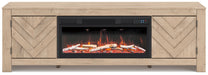 This TV stand with electric fireplace embraces a classically charming aesthetic and repurposes it for modern living. Its light replicated wood grain appeals to your love of vintage character, while the chic chevron pattern is effortlessly on trend. Media accessories stay tucked away in style with hidden storage behind the doors. And for added ambiance, the electric fireplace brings a cozy-cool vibe to your living room. With the touch of a button, activate the LED-lit flame and adjust the temperature or the flame brightness. The flame effect includes multiple color options and a realistic-looking faux birch log set.