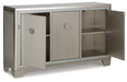 Reflect your love for contemporary style with this accent cabinet. It features a mirrored top and beveled mirror accents, adding both light and a touch of glam to your space. Decorated with faux crystal and chrome-tone pulls, the textured silvertone door fronts open to reveal adjustable shelving to meet all your storage needs.