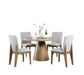 - Introducing the Delphine 5-piece dining set - the perfect addition to any home that loves to entertain! This set includes a stunning round dining table with a spacious 52" wide tabletop that comfortably seats four people, and four armless dining chairs crafted from high-quality materials. The table features a beautiful oak finish that adds a touch of rustic elegance to any dining room, while the chairs boast a sleek and minimalist design that elevates any dining space. Whether you're enjoying a casual breakfast or a formal dinner party, this set is sure to impress your guests and create unforgettable memories for years to come. Invest in the Delphine dining set for a timeless design and exceptional durability that you and your loved ones will enjoy for generations.