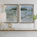 This Petite Diptych Displays An Abstract Landscape In Cool Powder Blue And Forest Green Tones. Each Print Is Complemented By A Delicate White Linen Liner And A Brushed Champagne Silver Frame. Artwork By Christina Long.
