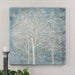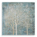 Hand Painted On Canvas, This Landscape Artwork Features A Contemporary Style. Metallic Silver, Gold, And Champagne Silver Trees Are Set Against A Lightly Textured, Mottled Light Blue And Beige Background. The Canvas Is Stretched And Attached To A Wooden Frame. Due To The Handcrafted Nature Of This Artwork, Each Piece May Have Subtle Differences. Artwork By Kinder.