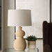 The Pueblo Table Lamp Combines The Rustic Beauty Of The Southwest With A Touch Of Timeless Elegance And Classic Silhouette. Crafted With A Heavily Textured Ceramic Base In A Warm Organic Clay Finish And Enhanced With Plated Brushed Antique Brass Details. The Slightly Tapered Round Drum Hardback Shade Is A Light Beige Linen Fabric.