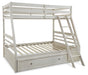 | Details | Includes twin/full bunk bed panels, twin/full ladder/rails/slats and under bed storage, Made with hardwood solids, birch veneer and MDF substrate, Antiqued white finish with grain texture, 1 under bed storage box with casters, Dark bronze-tone knobs, Top bunk with protective side rails, Sturdy ladder leads to top bunk, The Consumer Product Safety Commission states top bunks not be used for children under 6 years of age, Beds do not require foundation/box spring , Mattresses available, sold separately , Assembly required | |
