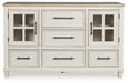 This dresser elevates the art of modern farmhouse design. Its two-tone aesthetic blends antiqued white and light grayish brown for a charming finish. Framed drawer fronts and windowpane cabinets lend a country feel. Conveying a feeling of relaxed comfort, the dresser is sure to carry you away to a dreamy time and place.