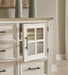 | Details | Made with hardwood solids, veneers and MDF substrates, Two-tone finish (antiqued white and light gray wood tone), Dark rustic bar pulls, 2 glass-front cabinets, each with adjustable shelf, Door includes interchangeable wood veneer panel (ships with glass panel installed), 5 drawers with fully finished interior, dovetail construction and heavy duty ball-bearing side glides (top drawer felt lined) | |