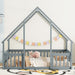 Full Wood House-Shaped Floor Bed With Fence, Guardrails - Gray