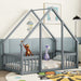 Twin Wood House-Shaped Floor Bed With Fence, Guardrails - Gray